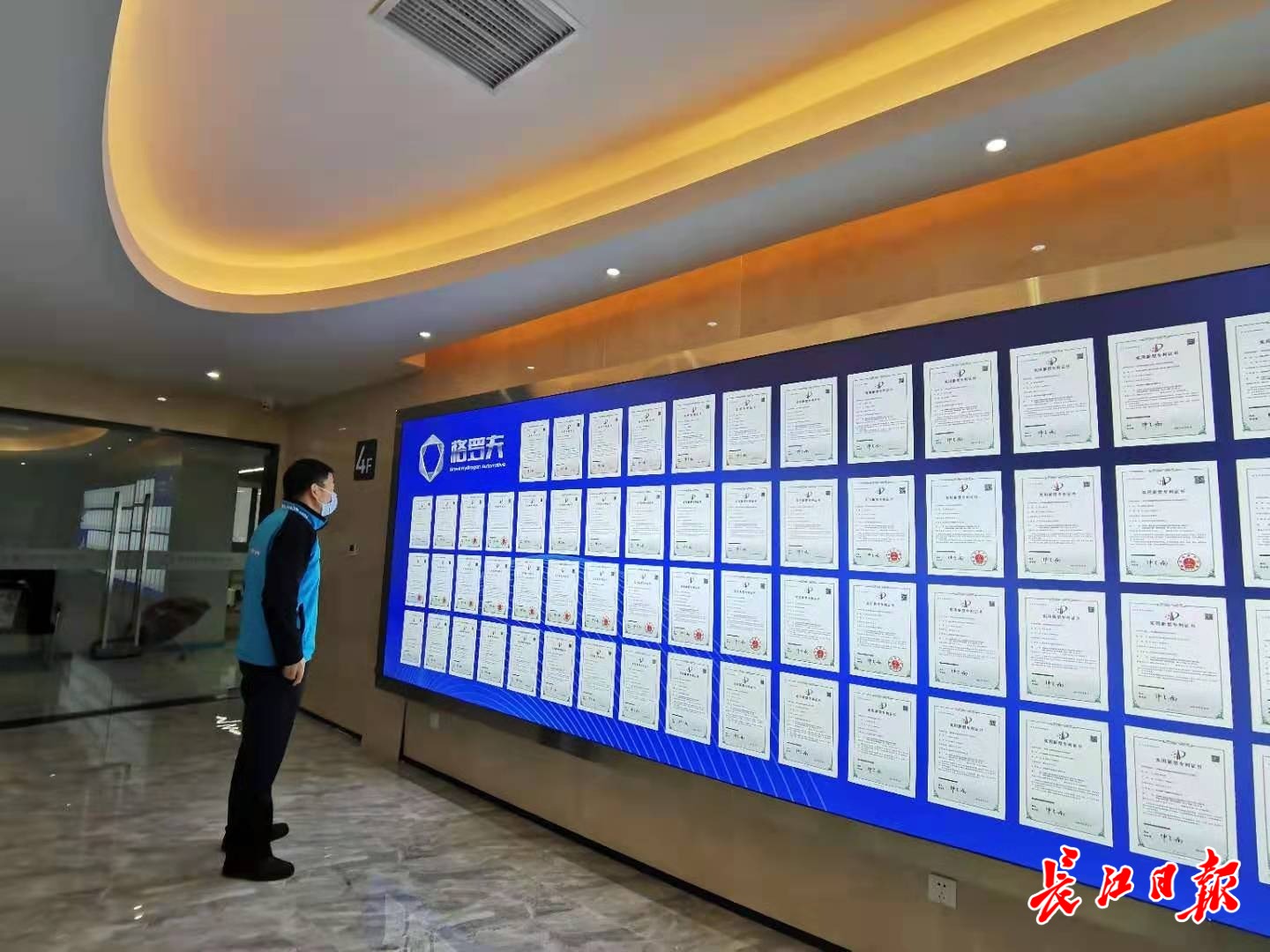 在武汉格罗夫,一段长约5米的专利墙汇集了企业多项核心专利。长江日报记者刘睿彻 摄