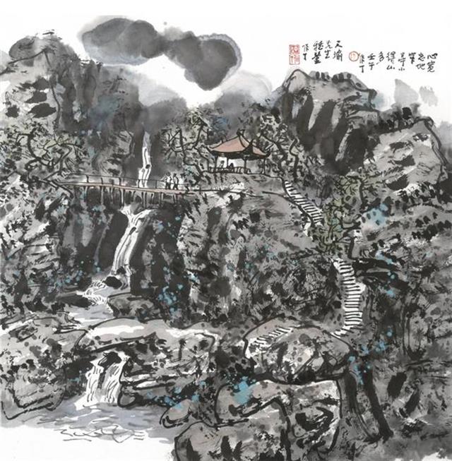 山水画幅题诗:“心宽忘地窄,亭小得山多。”录自宋人戴复古《题春山李基道小园》。朱文名章“陈”,白文名章“陈”“作丁”。上面写了“天瑜先生雅鉴”。
