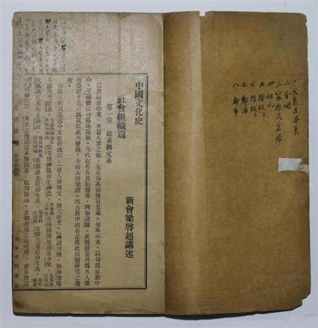 梁启超《中国文化史·社会组织篇》铅印本讲义,上面有冯永轩先生手批