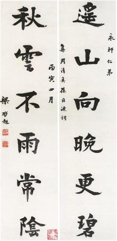 楷书六言联:“遥山向晚更碧 秋云不雨常阴”。上联题赠“永轩仁弟”“集周清真孙巨源词”,下联记时“丙寅四月”(1926年5月),落款“梁启超”,白文名章“新会梁启超印”,白文闲章“任公四十五岁以后所作”。