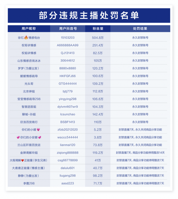 3月19日晚间,抖音安全中心发布《“卖惨带货、演戏炒作”违规行为处罚公示》(以下简称“公告”)。公告称,平台已对卖惨带货、编造离奇故事、演戏炒作等行为进行违规处罚。近30天内,平台共处理相关违规直播间446个,封禁违规账号33个,包含“徐忆 情感电台 ”“权哥讲情感”“光头哥”等10个粉丝超百万主播,另有“金牌调解玲姐”等多位主播被封禁直播权限。