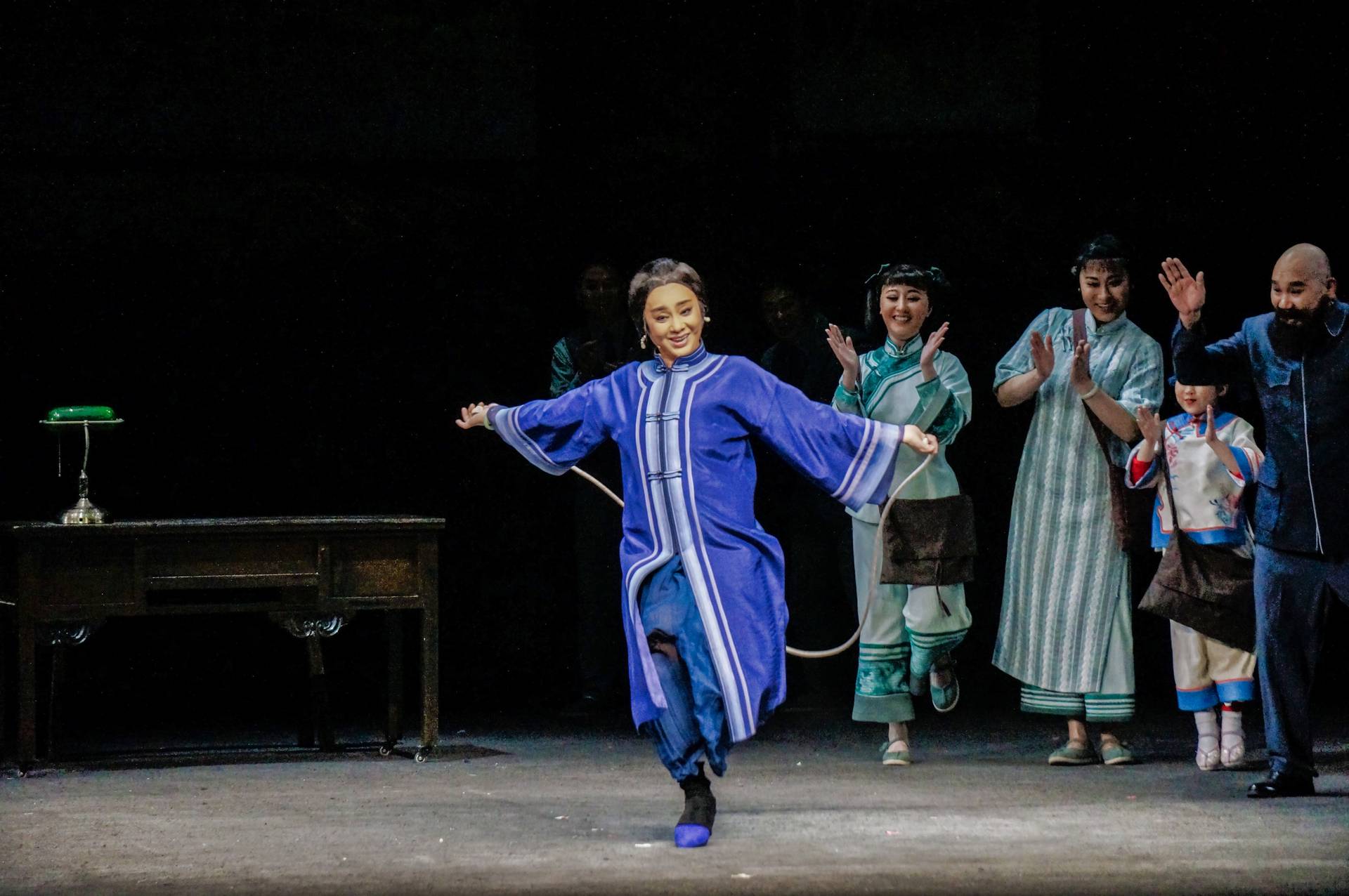 台词中提到“三寸金莲”时,观众突然发现,刘子微竟是踩着跷演出的。因为练习难度大,“跷功”在舞台上极少见。但在《母亲》中,为了更好地呈现葛健豪“三寸金莲走世界”的故事,刘子微不仅全程“踩跷”演出,还踩着三寸的跷跳绳、跳康康舞。