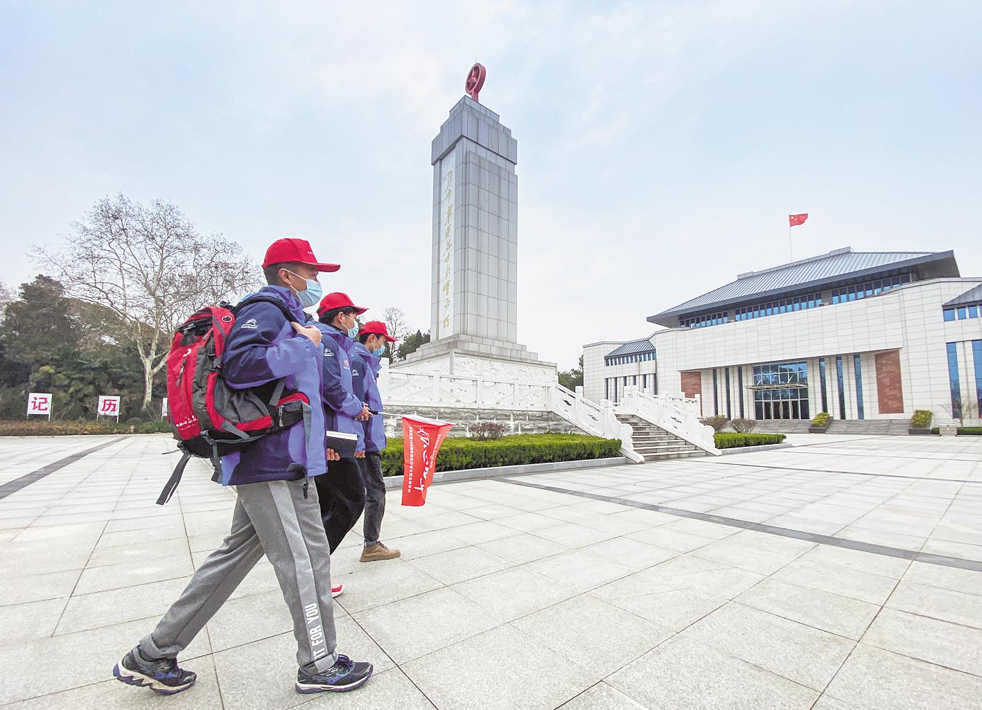 ▲“初心百年——荆楚大地的追寻”全媒体报道小分队步入鄂中革命烈士纪念馆。馆前,立有“鄂中革命烈士永垂不朽”纪念碑。