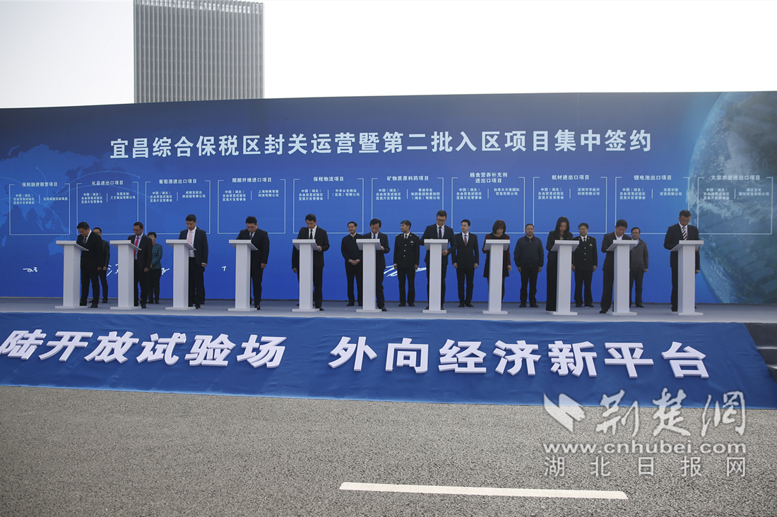 活动现场,宜昌市委副书记、市长张家胜宣布“宜昌综合保税区正式封关,首批货物入区”,并与武汉海关关长杨杰一同为综保区揭牌。现场新签约项目20个,预计达产后可新增进出口额18亿美元。此外,综保区还与10家配套服务企业签署了合作备忘录。