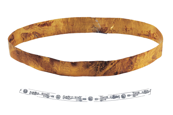 商周人面鱼鸟箭纹金王冠带,金沙遗址出土。