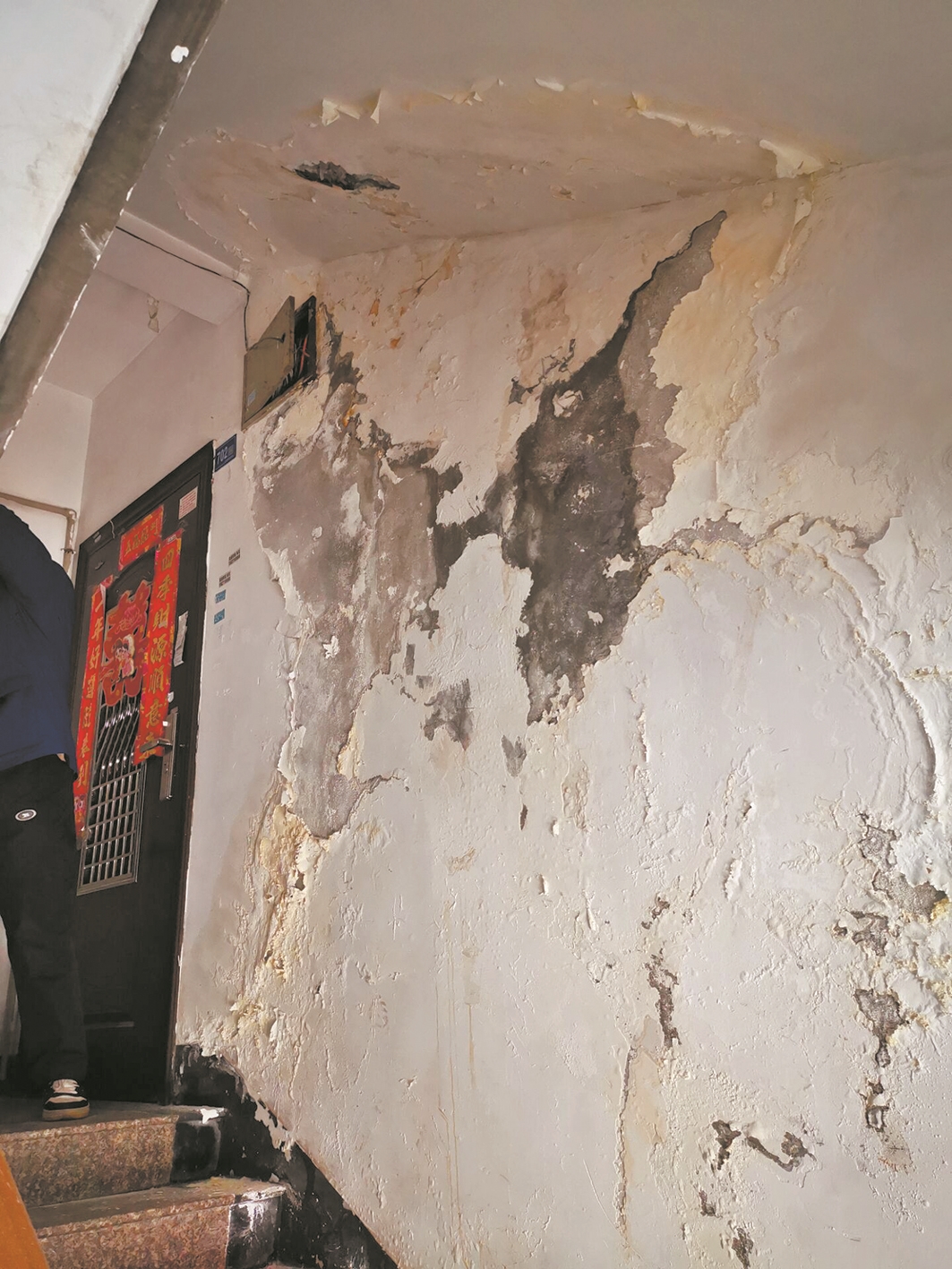 1单元7楼的居民反映,现在不仅楼道内的墙面漏水,家里的墙面、飘窗等处也出现了漏水,对生活造成影响。E栋2单元7楼居民夏先生也反映,家里的卧室、餐厅等多处墙面和墙角出现漏水后的痕迹,而且墙壁发霉、墙皮脱落。