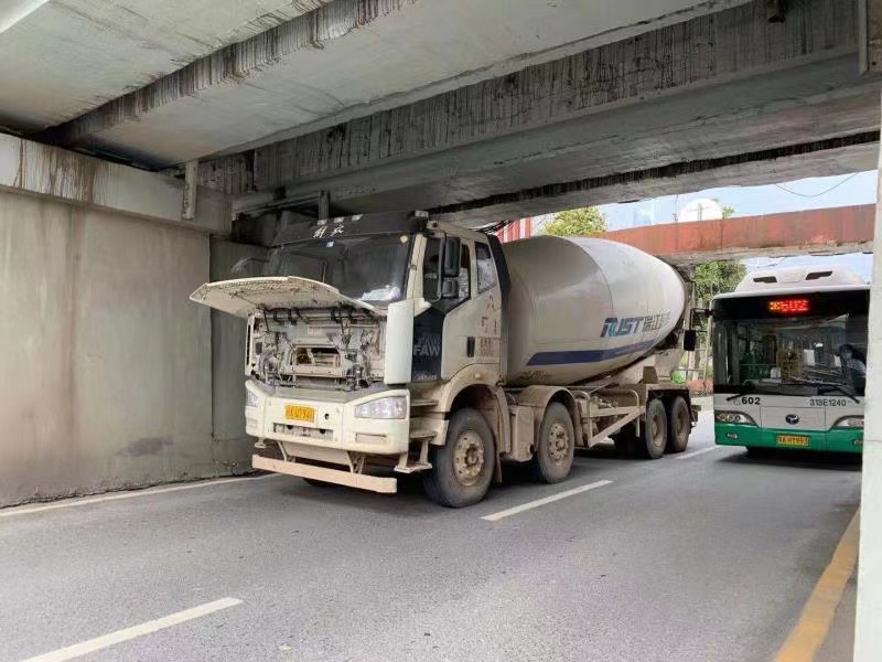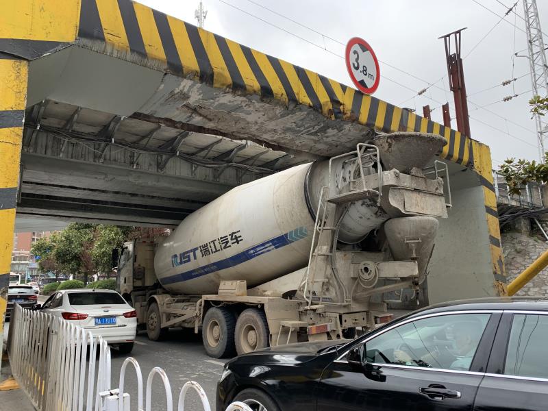 该车被卡的视频显示,一辆罐体印有“瑞江汽车”字样的水泥搅拌车,车尾进料斗连同部分罐体卡在限高3.8米的限高架下,刷有黄黑警示彩条的限高架被剐蹭痕迹明显,旁边一名疑似司机模样的男子正在拨打电话。