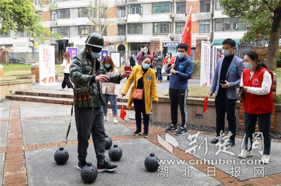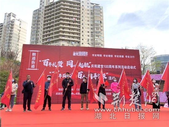 荆楚网(湖北日报网)讯(通讯员吴迪、王孝玉)3月23日上午,在武汉市武昌区昙华林泛悦汇广场,粮道街道“百年礼赞 同心起航”庆祝建党100周年“十个双百”系列活动启动式暨“百年同心·百人同寻红色根”活动,在“小龙人”欢快的舞龙舞狮暖场节目中拉开序幕。
