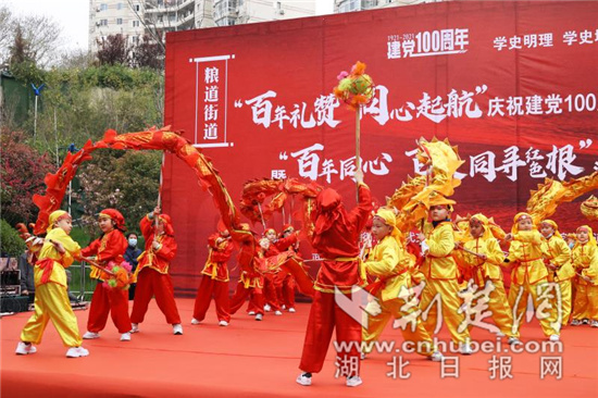 “小龙人”欢快的舞龙舞狮节目,拉开了武昌粮道街道“百年礼赞 同心起航”庆祝建党100周年“十个双百”系列活动序幕。黄梦云 摄