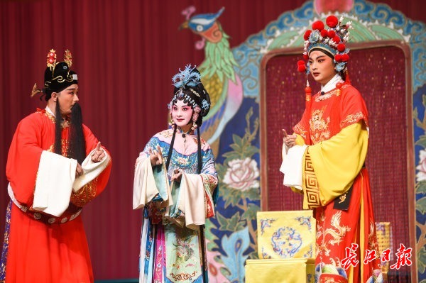 饰演柴郡主的林周楠去年毕业于中国戏曲学院表演(多剧种表演)专业,她说此次是她第一次排大戏。而她此前主攻花旦,《状元媒》中有不少武戏,“好在有导演孙伟老师一招一式教我,才有今天的舞台上的呈现。”林周楠透露,2019年她曾到武汉汉剧院学习汉剧《凤仪亭》,提起耿丽亚饰演的貂蝉角色,她赞不绝口,“当时耿丽亚老师给我们剖析人物、做示范,对我在汉剧唱词、念白、表演等方面帮助很大。”