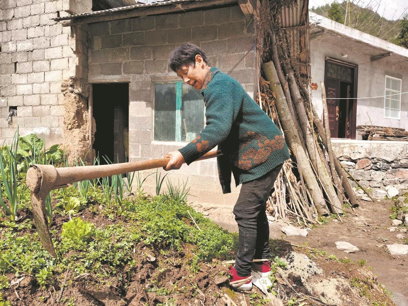“前几天下雨,今天出太阳了,要抓紧锄草松土,这段时间忙春耕,玉米要播种了。”黄文桂说起话来就爱笑,一只左手干活十分熟练。她家有2亩多地,种了玉米、红薯和土豆,从家里走过去得翻几个山头,步行一个多小时。早上煮了点面条后就出门,一直要忙到太阳下山才回来。