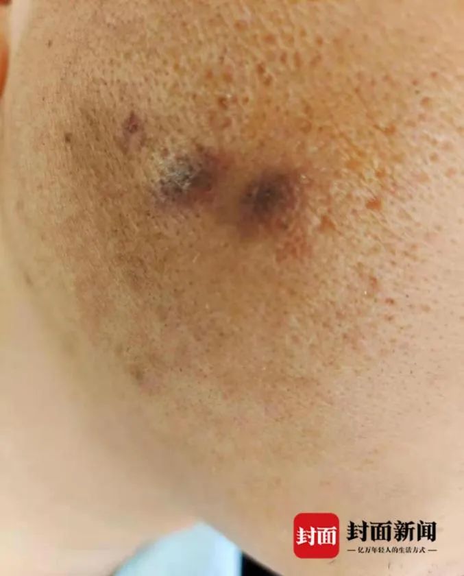 刘尧提供的西安高新医院的急诊病历显示,病人“烟头烫伤致右侧面颊疼痛2小时”,其提供的照片可以看出,其右侧脸颊可见两处不规则烫伤。刘尧表示,伤势已有所恢复,但仍有疤痕,医美人士称疤痕可以减淡但无法确保消失。