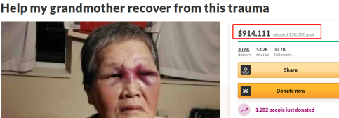 当地时间22日,75岁旧金山华裔老人谢萧珍遭白人青年无故殴打后反击一事,有了最新进展。谢萧珍女婿陈德和称,在扣除相应手续费和法律维权费用后,家人准备将收到的筹款全捐给社区机构支持反歧视、反暴力活动。此外,他和太太还决定另捐1万美元。
