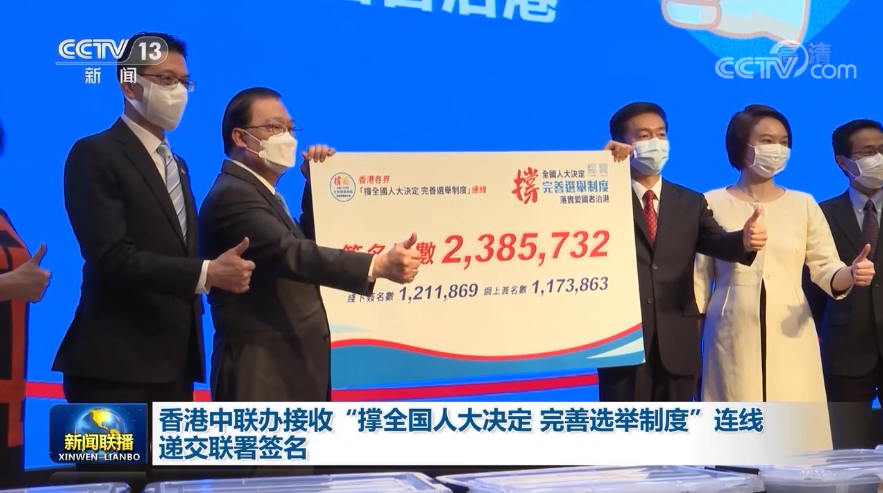 央视网消息(新闻联播): 24日上午,“撑全国人大决定 完善选举制度”连线召集人以及各界代表前往香港中联办,递交支持全国人大完善香港选举制度的决定联署签名行动中收集的超过238万个签名,希望向中央转达香港市民坚定支持相关决定的意愿。