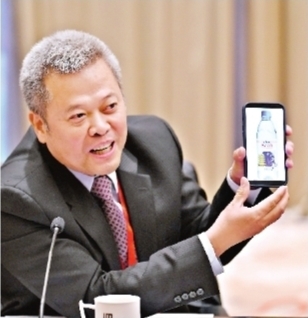 达能亚太(上海)管理有限公司对外事务副总裁邹春义现场推荐印有黄鹤楼图案的依云“城市瓶”。