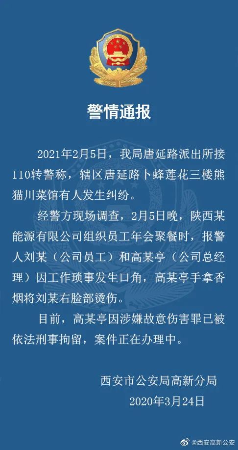 @西安高新公安 3月24日发布警情通报 :陕西一公司总经理拿烟烫伤员工右脸,涉嫌故意伤害罪被刑拘。