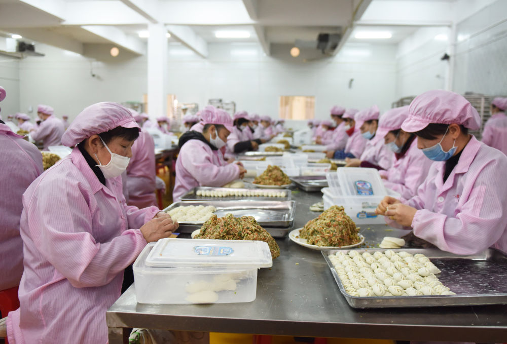 ↑2019年1月12日,工作人员在沙县一家公司的车间内制作蒸饺。该公司制作的蒸饺主要配送给经销商,再由经销商转给沙县小吃加盟店。
