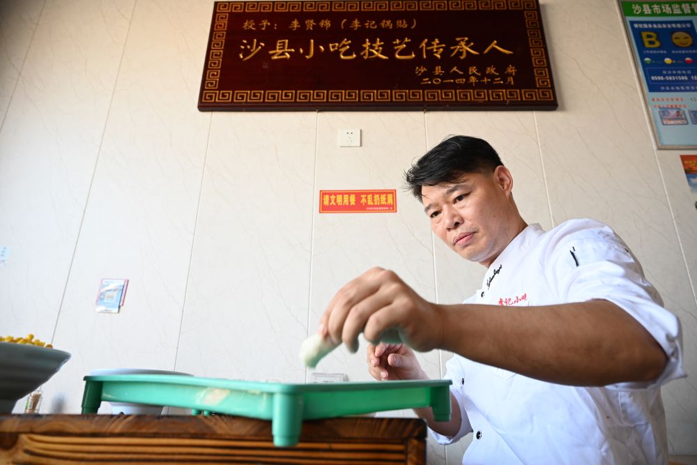 ↑2020年11月18日,在沙县文昌美食街,沙县小吃技艺传承人李贤锦在包锅贴。