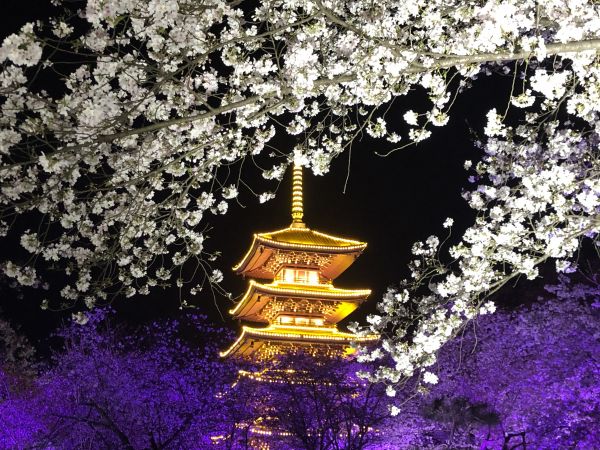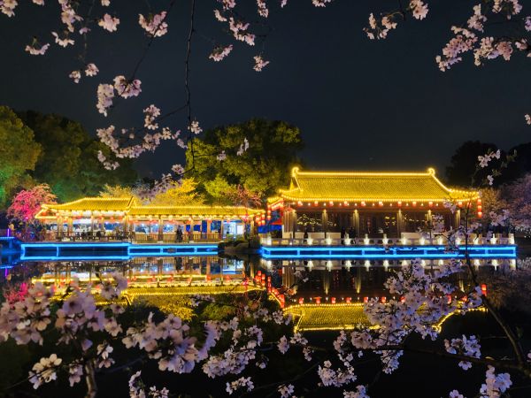 “白天赏樱花本身,夜间赏樱花园意境。”傍晚时分,暮色将樱园笼罩,园内彩灯尽数亮起,423亩东湖樱花园被瞬间点亮。白天内敛典雅的曲院樱艳张扬了起来,飞檐上挂着红彤彤的灯笼,与极具古风的仙鹤画舫交相辉映;五重塔静静矗立,描金勾勒出东湖樱花园最亮眼的部分;花溪流水潺潺,倒映出五彩斑斓的灯影,如梦如幻。