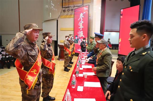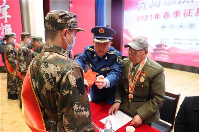 欢送大会在庄严的国歌声中拉开帷幕,主要议程由抗美援朝老英雄、优秀复退军人代表为新兵们佩戴大红花。两位老英雄都已80多岁高龄,虽行动不甚方便,但双目依旧炯炯有神。只见老人小心翼翼地将红花系在新兵胸前,戴花完毕,新兵以敬礼向老英雄致敬,老英雄回以军礼给予希望。给新兵戴红花不仅是一种仪式,更是一种传承,将报国从军、艰苦奋斗的革命精神赓续下去......