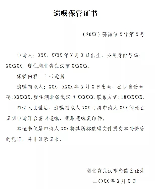 此前,武汉市无人申请办理该项公证服务。“在全国公证遗嘱备案查询平台,给徐女士出具的这份《遗嘱保管证书》是武汉市出具的首份。”陈丹妮说。