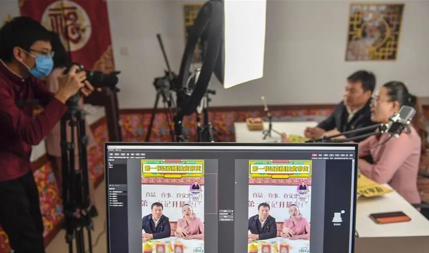 吉林省白山市靖宇县大北山村驻村第一书记高世龙(右二)与吉林省蛟河市青背村驻村第一书记曾丽圆“直播带货”推介农副产品。新华社记者 许畅 摄