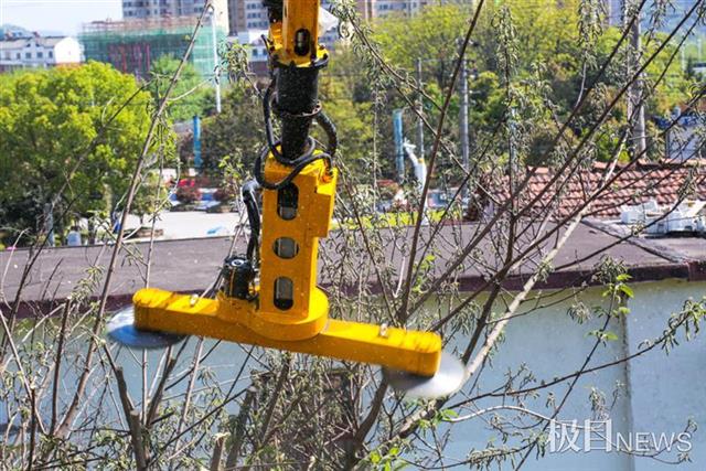 3月25日中午,在京广线咸宁至官塘驿段,铁轨上一台特殊的作业车正缓缓移动,车辆尾部伸出的机械手臂来回转动机头,不断将铁路线旁可能危及行车安全的树木进行修枝。只见被锯断的树枝不断掉落在铁路防护网外,整个过程一气呵成。