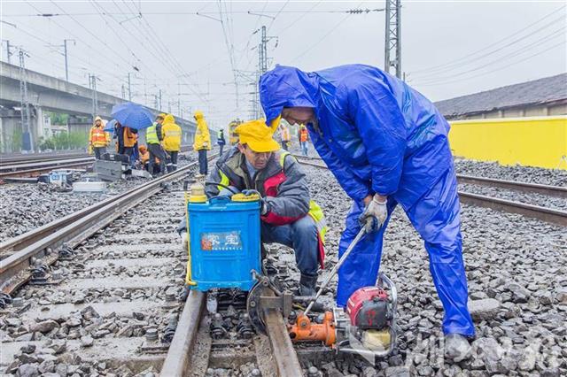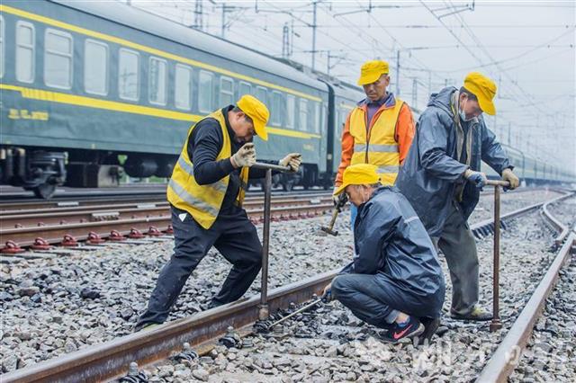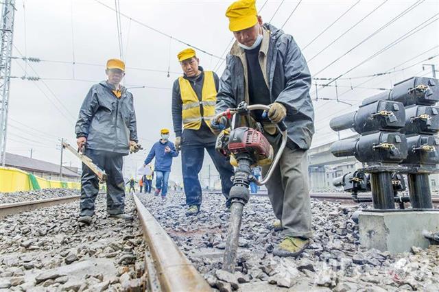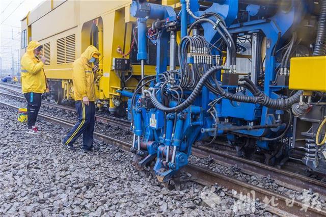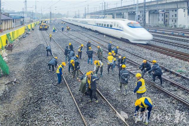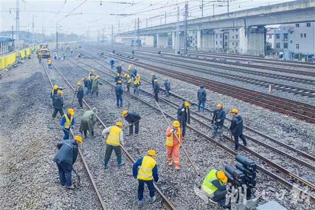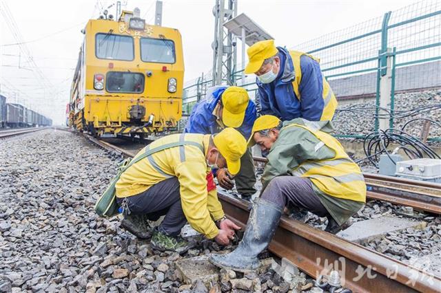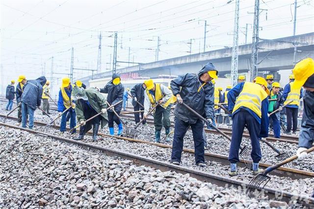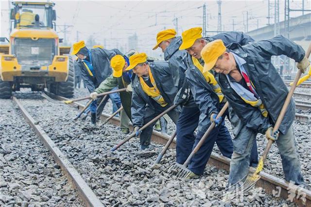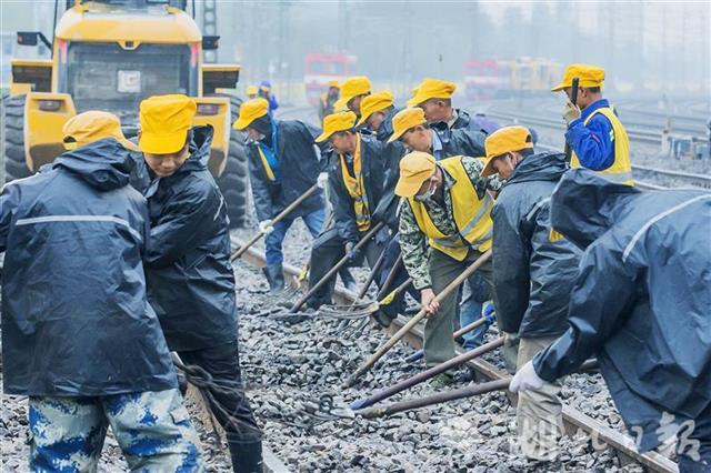 4月1日,武汉丹水池站到发线及牵出线新建铁路工程施工现场,中铁七局200余名施工人员正在冒雨奋战。施工人员调整道床、测量轨距,保证插铺道岔后的线路与既有铁路连接平整顺直。连日来,数百名施工人员顺利插入6组新道岔、拆除2组旧道岔,新建一条长1050米的到发线、一条长850米的牵出线,4月1日下午完成全部施工。