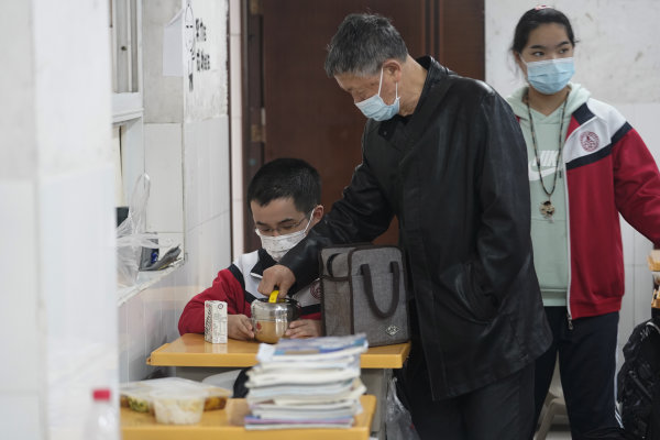 下午开课前,爷爷扶着吴限好去了趟洗手间后,爷爷又回到了自己的“老地方”,喝了一口热茶,打算休息一下。下午5:00,他还要回一趟家,拿了饭菜再给孙子送过来,再等到晚上7:40自习课下了后,爷孙俩一起回家。