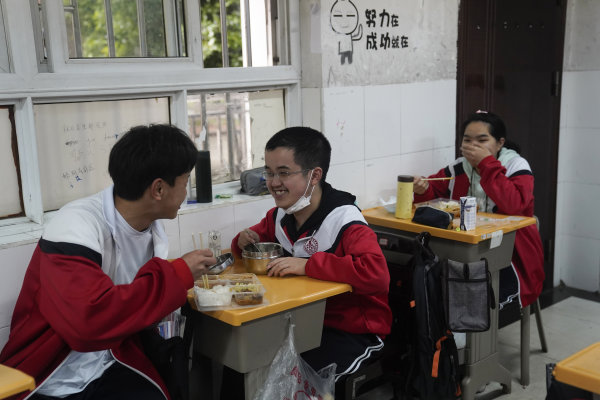 经过一上午的紧张学习,午餐时间到,教室里变得热闹起来,学生们纷纷领取学校配送的套餐,吴限好捧着奶奶做的“特供餐”跟同学们相谈甚欢,同学讲普通话,他就说普通话,同学讲武汉话,他马上切换成方言模式。“都是硚口的班子,不会讲武汉话有点说不过去。”吴限好说,他发现身边会说武汉方言的同龄人并不多,“但武汉方言有一种特别的幽默感,我时不时会飙几句。”