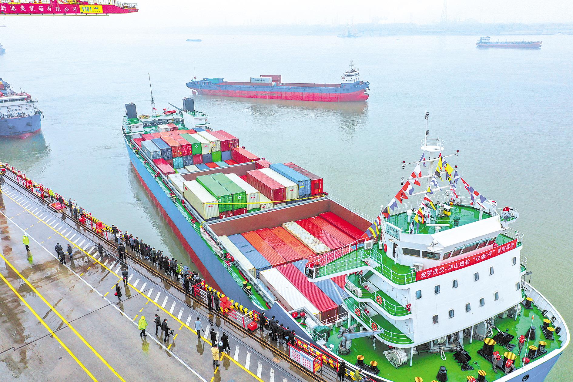 2月28日,“汉海5号”集装箱轮缓缓离开武汉新港阳逻港二期码头,装载湖北和湖南两省的医疗用品、机械设备等产品驶往上海洋山港,再出口至东南亚和欧美地区。 (湖北日报全媒记者 陈勇 摄)