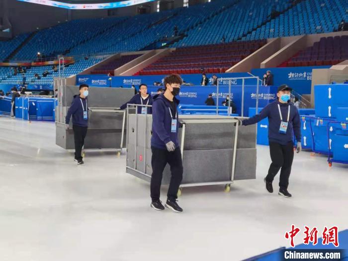 本次测试比赛花样滑冰与短道速滑项目安排紧密,项目间场地的迅速转换是首都体育馆承办比赛时面临的一个挑战。首都体育馆场馆群运行团队短道速滑转场团队的秦宬庚是离赛场最近的志愿者之一,他的志愿者岗位就在比赛的冰面边上。秦宬庚介绍称,志愿者需要尽量在半小时内在冰面上完成场边护垫更换和裁判席转换,为接下来专业工作人员调整冰面做好准备。