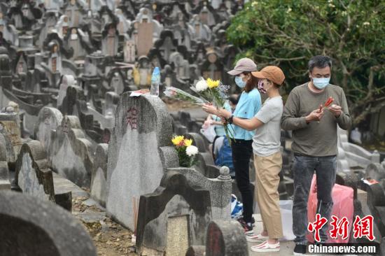 4月4日是清明节,细雨纷飞,香港有市民带上鲜花、香烛等拜祭用品到钻石山坟场扫墓祭祖。图为香港市民以鲜花拜祭先人。 中新社记者 李志华 摄