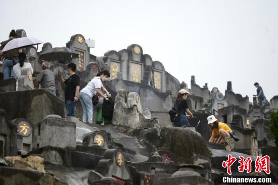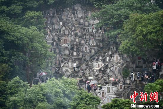 4月4日是清明节,细雨纷飞,香港有市民带上鲜花、香烛等拜祭用品到钻石山坟场扫墓祭祖。图为香港市民于雨中扫墓。 中新社记者 李志华 摄