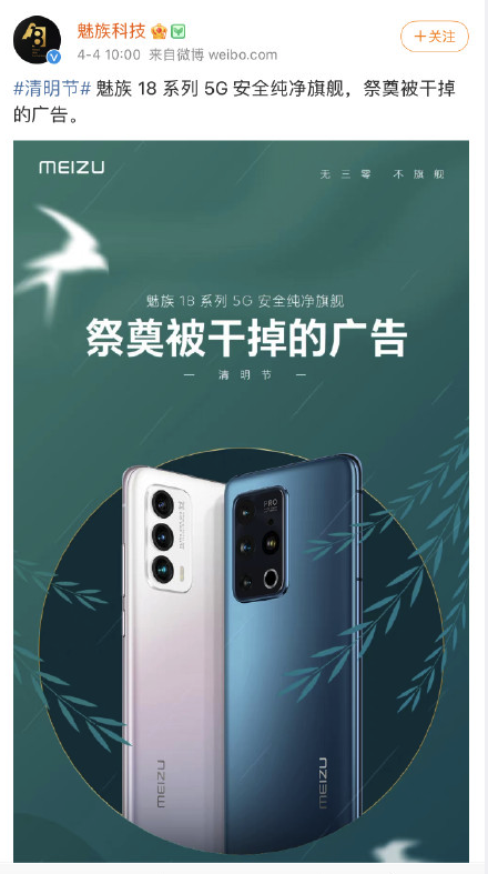 魅族科技争议微博广告图文发布于4日10时,主推产品为魅族某系列“5G安全纯净旗舰”手机,图片正中产品照片上方标有“祭奠被干掉的广告”8个白色大字,大字下方还有“清明节”三个小字。其微博文字除了上述广告语外,也加了“清明节”作为标签。