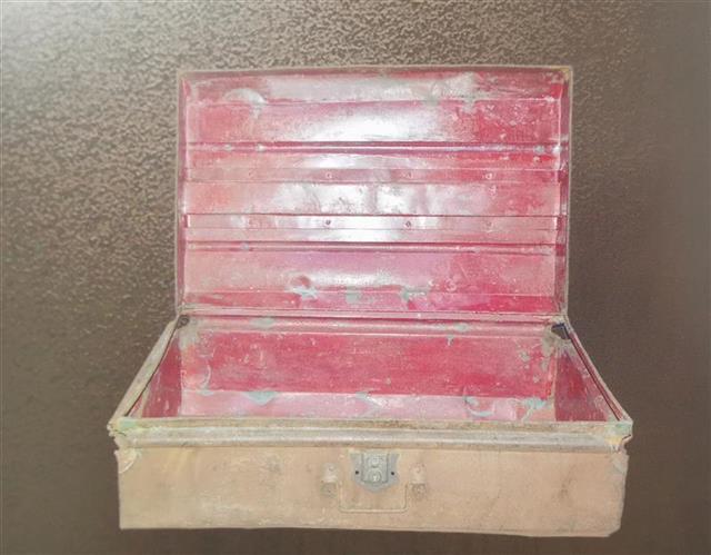目前陈列在毛泽东同志旧居的这口铁皮箱,长70厘米,宽50厘米,高27厘米。铁箱由白铁皮打制而成,箱内为红色。箱盖上有两个横杠,箱盖及两侧各铆有8个铁质乳钉用作加固及装饰。箱子的正面和两侧各有一铁制吊环拉手。