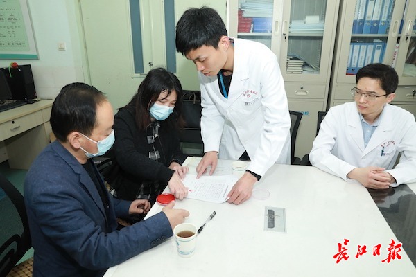 武汉大学中南医院器官捐献与获取组织(OPO)工作人员张亮一边安慰王强的双亲,一边向王强父母介绍了器官移植的信息。