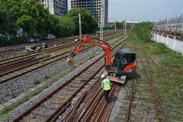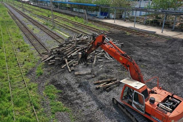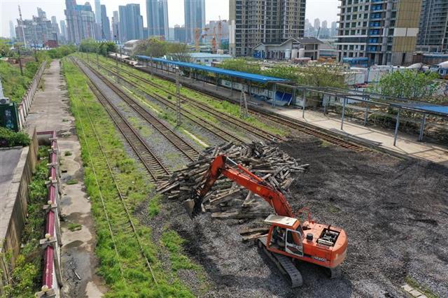 湖北日报讯(记者陈勇、通讯员吴忠超) 2021年4月8日,施工人员正在拆除武汉市江岸区徐州新村江岸车站附近一段老京汉铁路。京汉铁路起于北京卢沟桥,至于汉口玉带门,1906年建成通车。1991年10月,京广铁路汉口段改线投入使用,汉口丹水池车站至玉带门车站之间的老京汉铁路逐渐退出历史舞台,西段拆除后已建成京汉大道和轨道交通一号线,东段沿用至今,一直承担货运和铁路职工通勤列车的任务。2021年4月7日,这段长约3公里的老京汉铁路与京广铁路接驳处正式断开,完成了100多年的历史使命。目前,江岸车站信号楼、站台和铁轨等设施正在拆除,腾退出来的土地将建设二七滨江商务区。