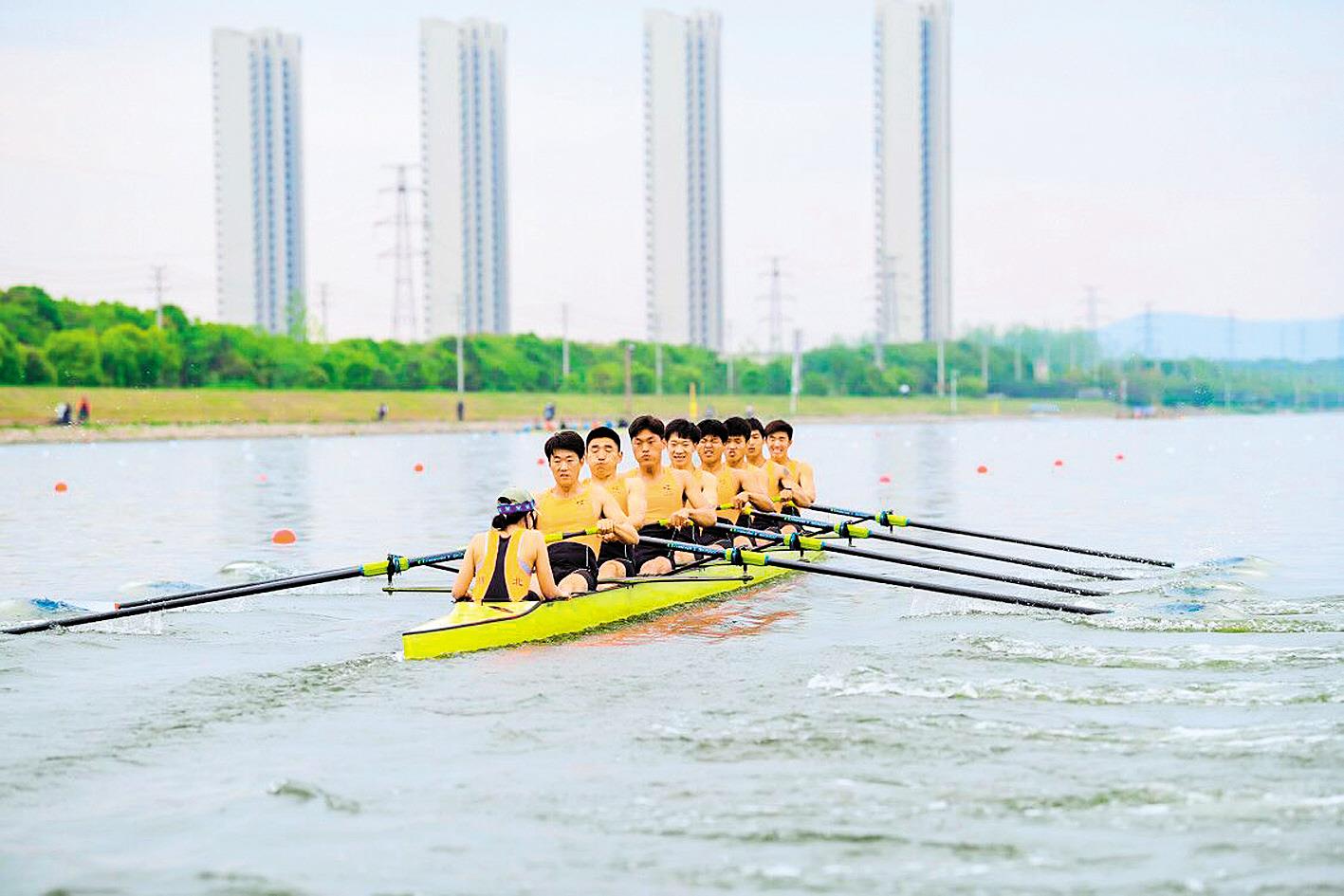 在男子八人单桨项目预赛中,湖北赛艇队挥桨奋楫。