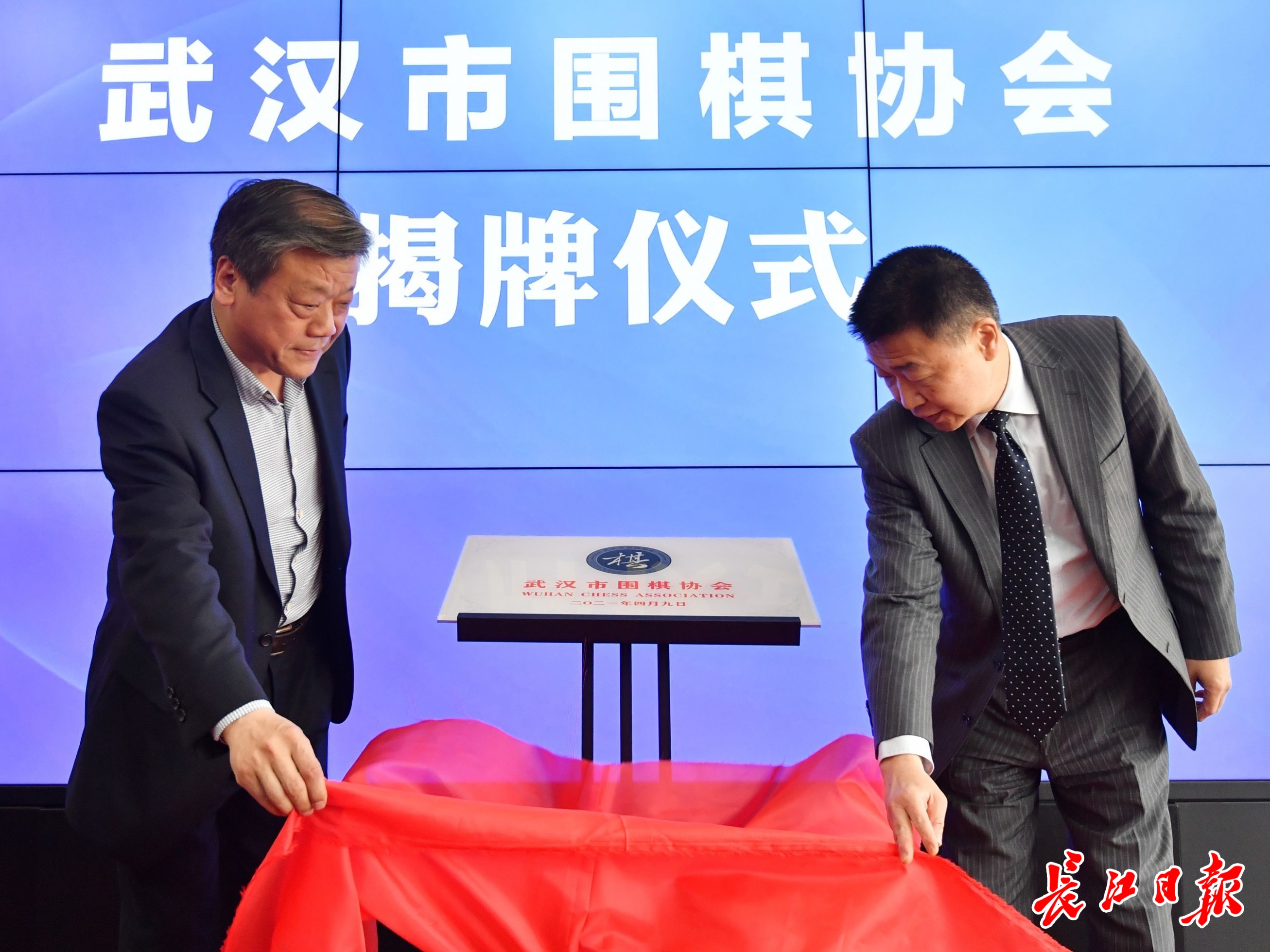 中国围棋协会副主席兼秘书长王谊(右)与武汉市体育局局长王沈顺为武汉市围棋协会揭牌。长江日报记者喻志勇 摄