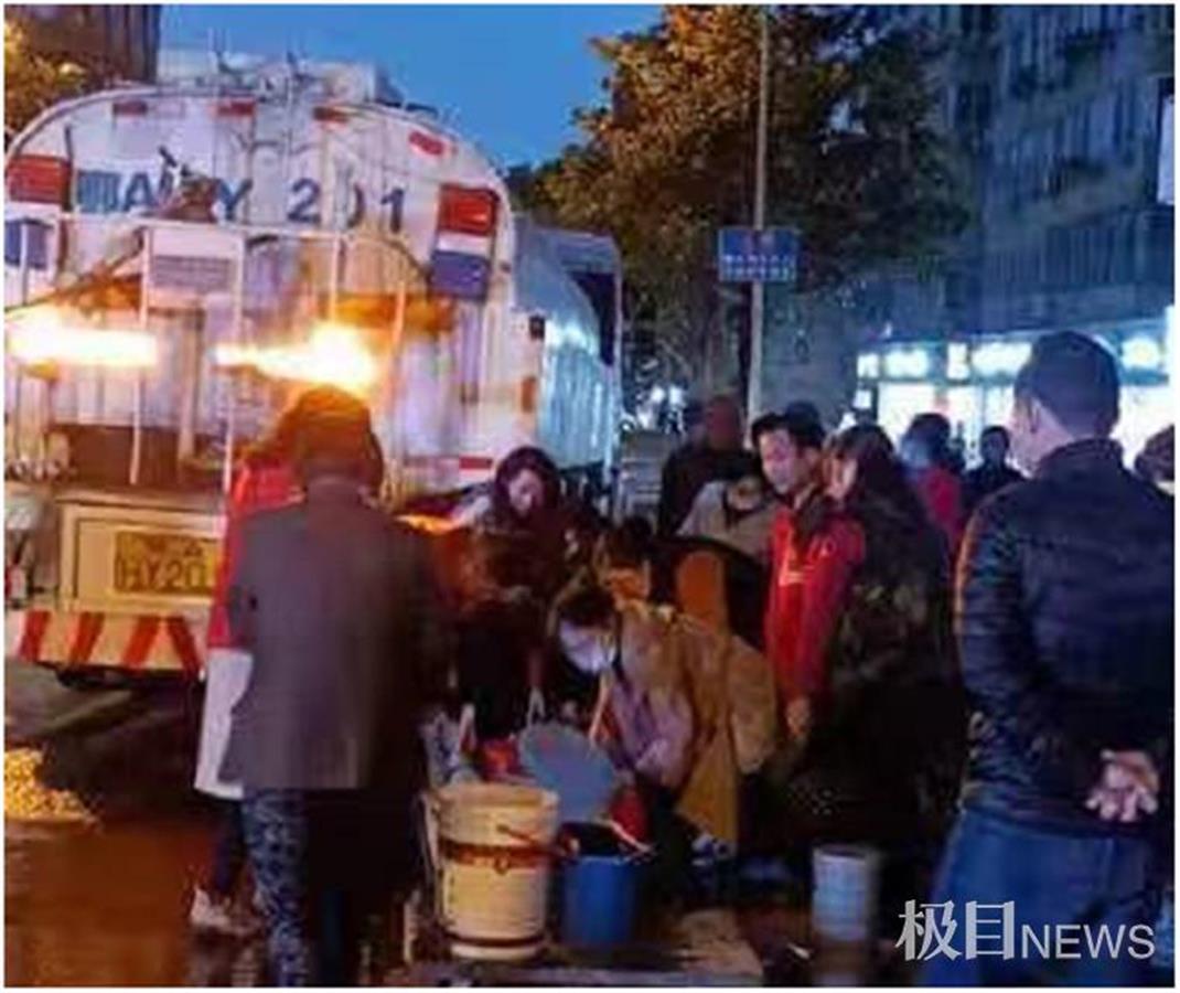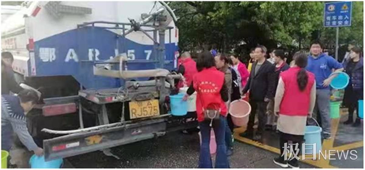 4月8日下午,武汉经济技术开发区沌阳街郭徐岭周边道路施工不慎挖断了主水管,导致周边小区数万居民无水可用,该区沌阳城管紧急送水为居民救急。