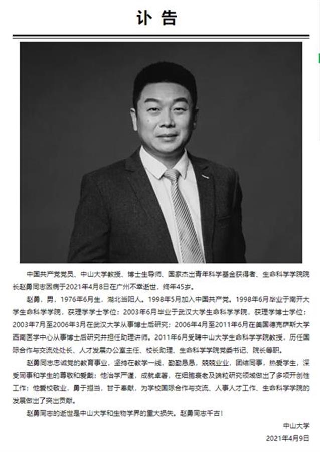 2021年4月8日,中山大学生命科学学院院长教授、博士生导师赵勇,在广州英年早逝,年仅45岁。