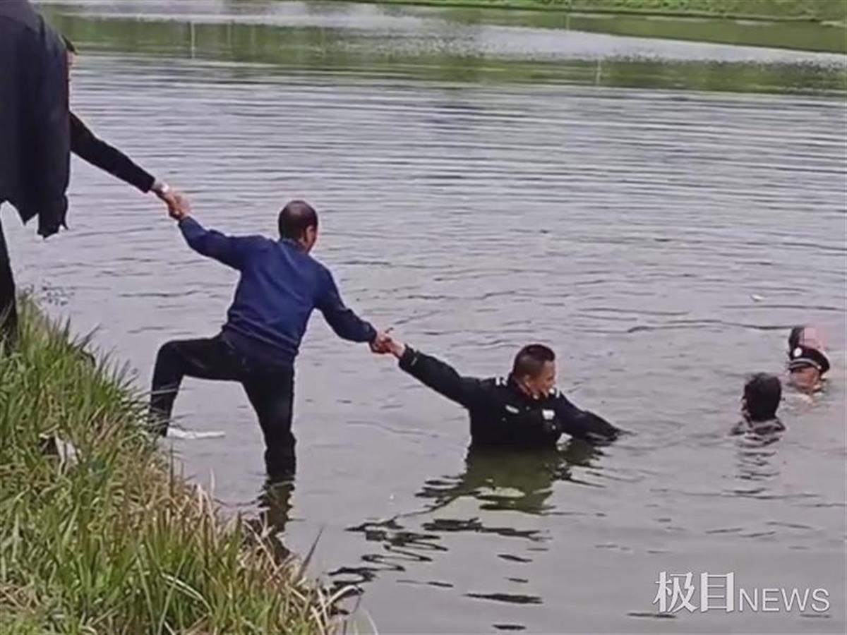 这时,女游客的老公范先生也飞快赶了过来,他跳进水塘施救。于是,在水塘中,吴利华抓紧女游客,范先生拉住吴利华,黄小龙拉住范先生。同时,在岸边上,六位素不相识的游客,也手拉手接力救人,大家一起合力把水里的四人拉上岸。整个救援过程不到十分钟。