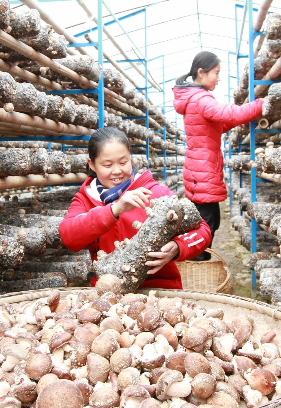 (2020年12月16日,湖北十堰市房县红塔镇油坪村食用菌产业大户汤景梅(前)在采收香菇/@视觉中国)