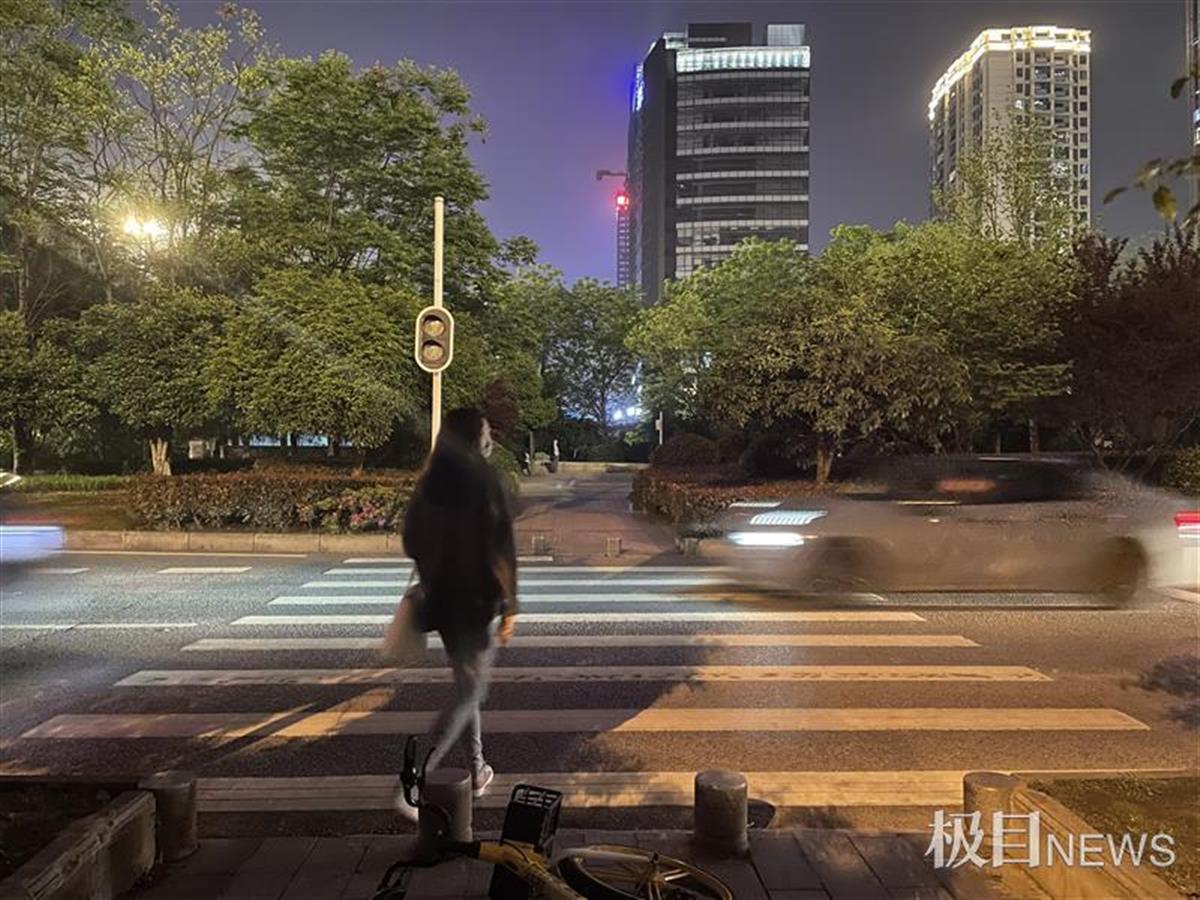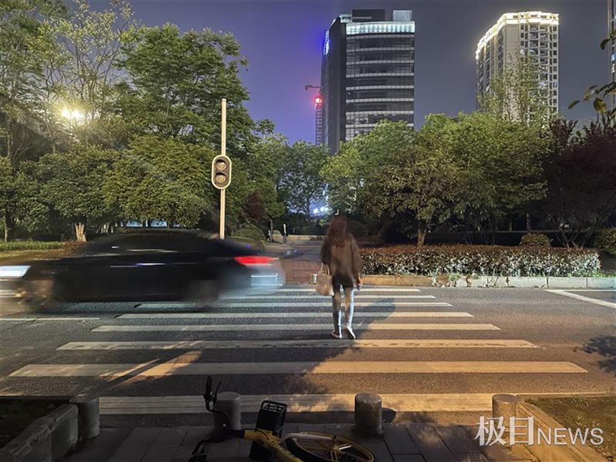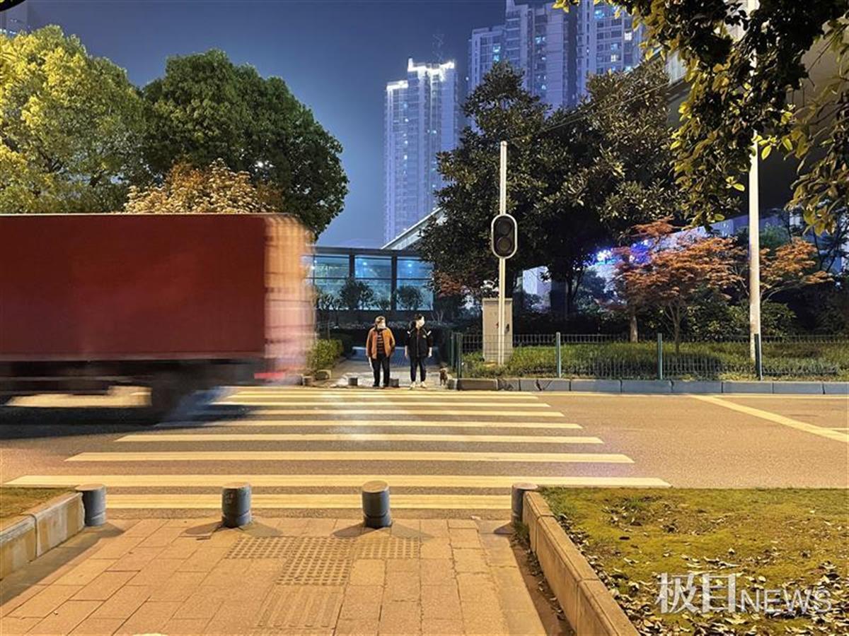 4月12日晚,极目新闻记者在该立交桥底下看到,斑马线两端的红绿灯均已停摆。行人要么在路边等车辆渐少时,小跑穿过马路;要么干脆就在车流中穿行。
