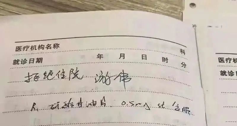 其中一张图片为医院的检查报告单,报告单显示“窦性心律、T波异常(可能是前侧壁心肌缺血)”“异常心电图”。另外一张配图则显示,医院病历上写有“拒绝住院,游伟”的字样。