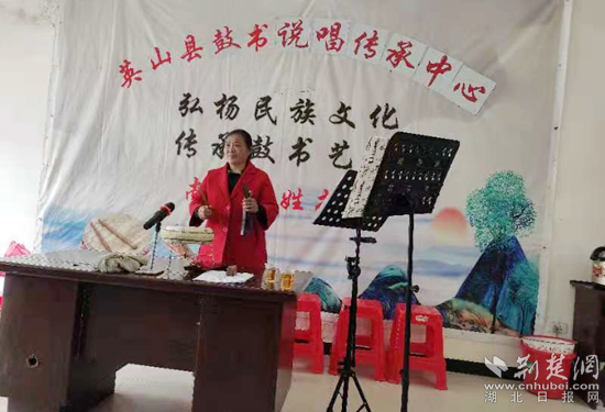 鼓书曾称为“说善书”,表演核心是劝告人们尽忠行孝,在上世纪六七十年代是民间广泛流传的一种艺术形式,深受广大群众喜爱。为进一步加大党史知识宣传力度,英山县将鼓书说唱传承中心的57名成员分布在四个乡镇固定演出点,通过鼓书的形式进行宣讲,目前中心成员通过说鼓书的形式参加宣讲50多场次,受众达10000余人。