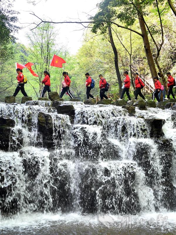 4月15日,保康县实验小学学生走进该县五道峡景区开展研学旅行活动。