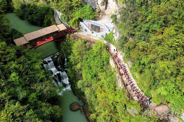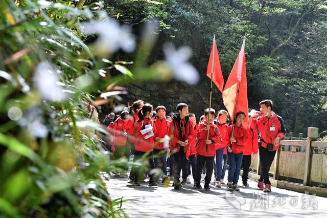 在五道峡景区,学生们在老师的带领下,感受峡谷山涧的美妙风景,聆听导游讲述卞和献玉等楚文化故事,了解各类珍稀野生动植物,在寓教于乐中感受家乡的生态环境与山水人文,在实践探索中增强团结强协作精神,培养坚持不懈的品质,引导学生热爱自然、保护自然。(视界网 杨韬 黄丽 摄)