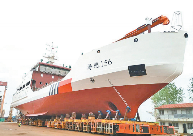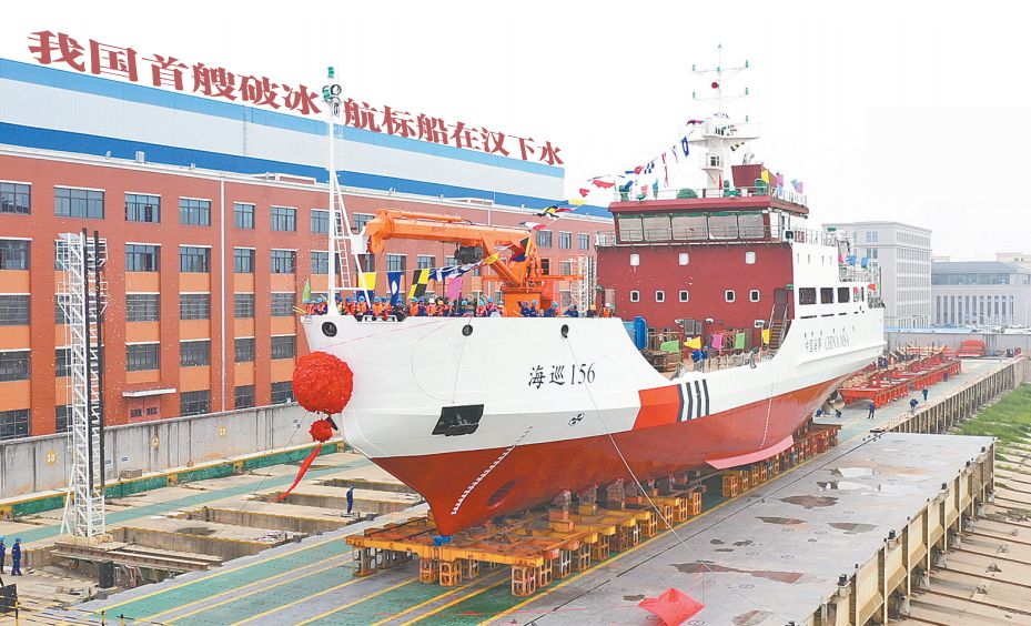 4月15日,我国首艘具备破冰能力的大型航标船“海巡156”轮在中国船舶武船集团双柳造船基地下水。